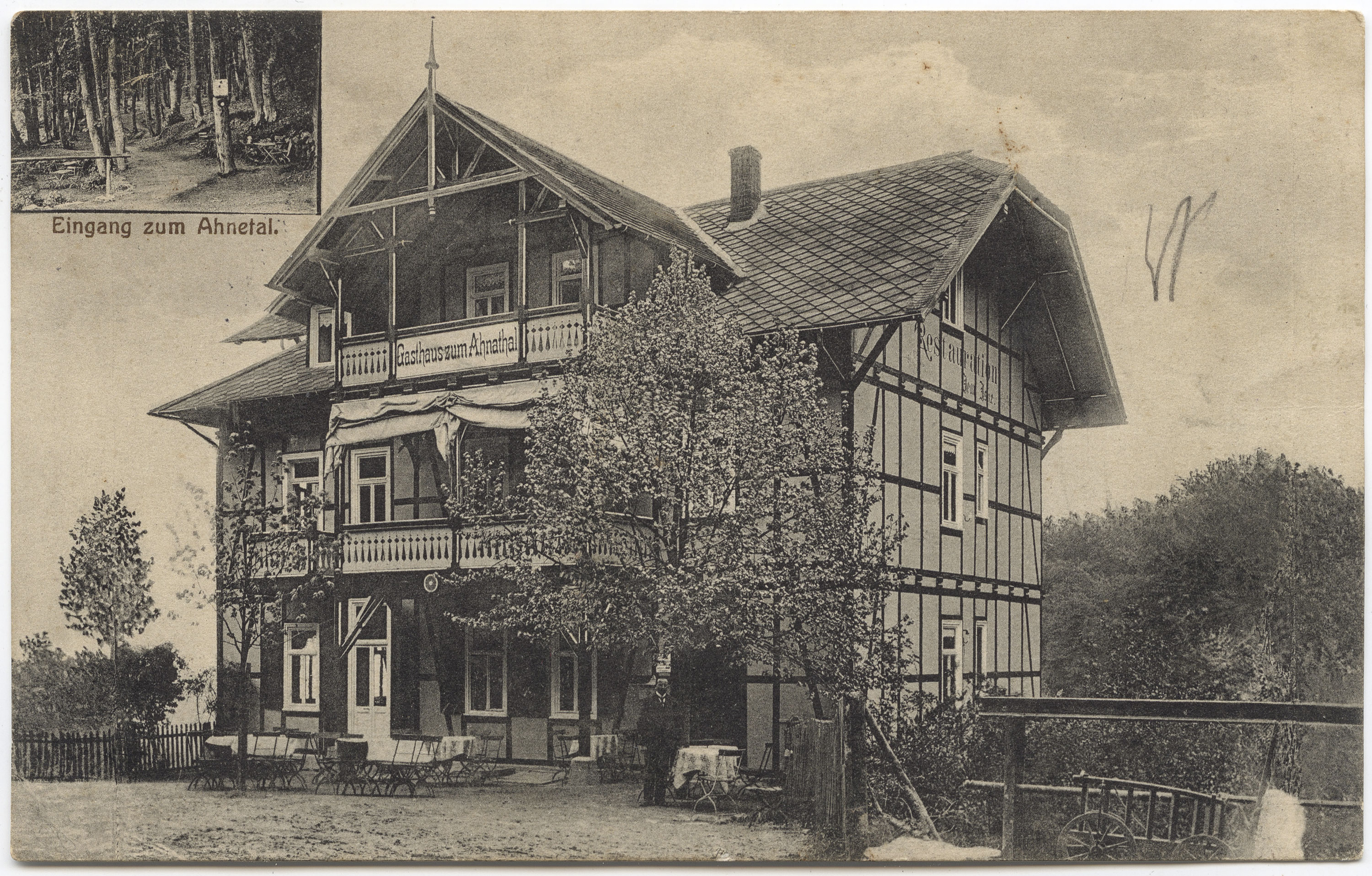 »Restauration Fritz Erkelenz«, gestempelt 1908. Das Haus, damals wie heute mit der Adresse Lange Straße 14, sieht noch genau so aus. Die Querstraße hinten ist die Bremelbachstraße.*MA