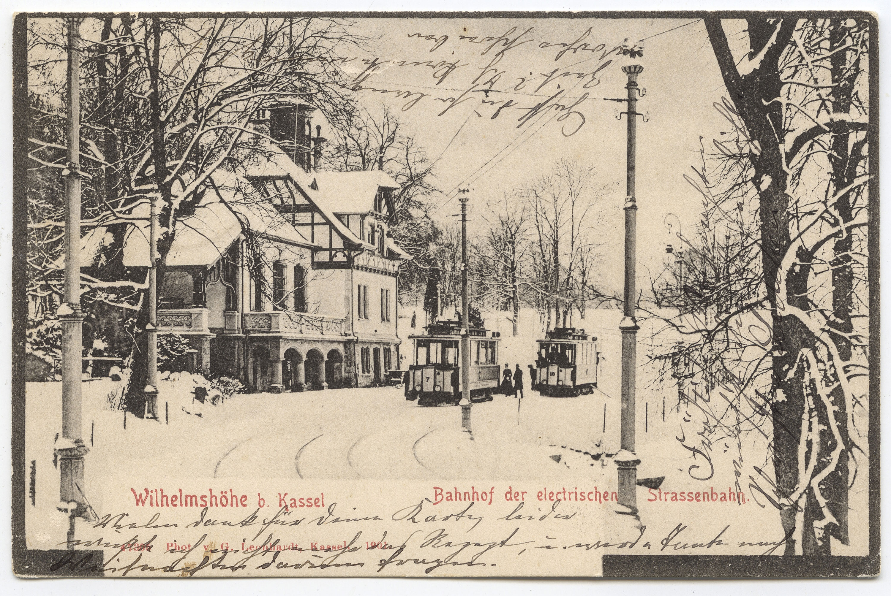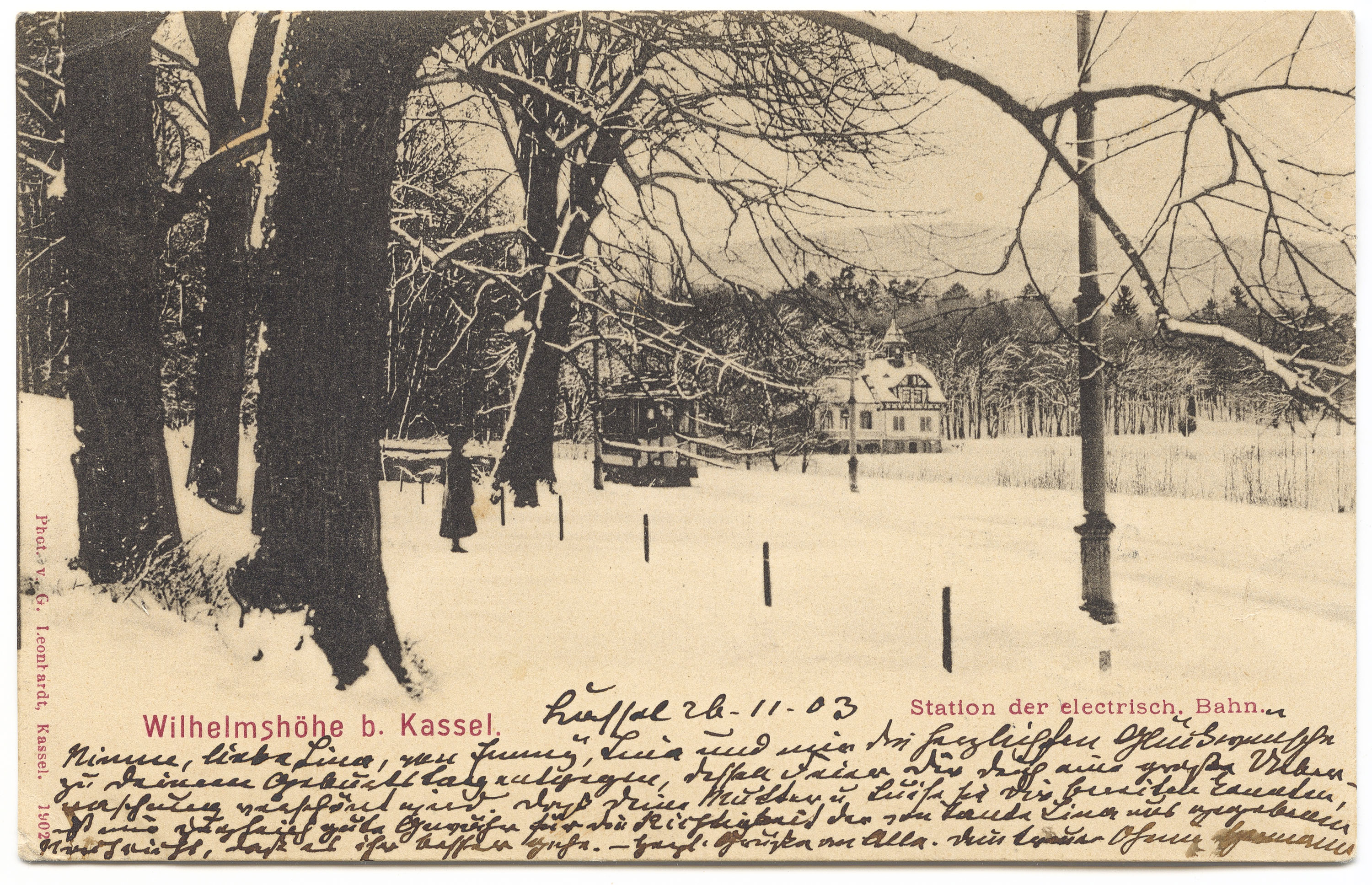 Verlag von Lina Müller, Wahlershausen (1903 gestempelt): Die Wilhelmshöher Allee in Richtung Bergpark. Auf dem Hause links kann man lesen: »[...] der Lippstädter Brauerei ›Weissen [...]«. Zwei Häuser weiter müßte die Wilhelmshöher Allee 283 sein.*MA