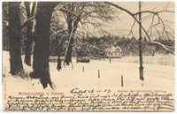 »Partie vor Restaurant Demmler (Chocoladenfabrik)«, gestempelt 1912. Das Restaurant Demmler lag in der Wilhelmshöher Allee 83, also weit vor Wahlershausen. (Hat da jemand einen gigantischen Herkules ungeschickt auf den Berg retuschiert?).*MA