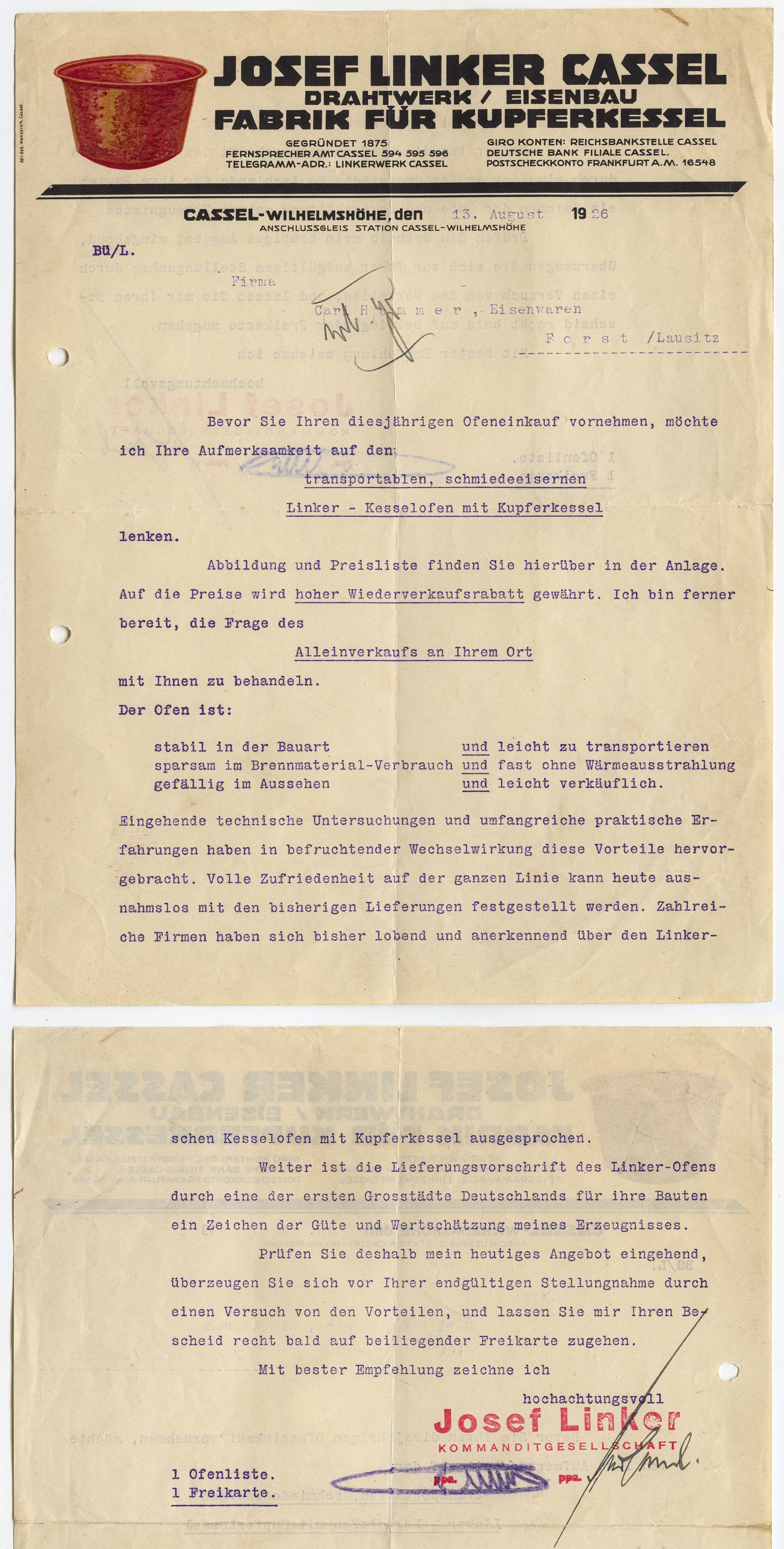 Darin viele Anzeigen von Wilhelmshöher und Kasseler Firmen (nur die Wilhelmshöher Firmen sind in die folgende Liste aufgenommen): [Seite 4:] Heinrich Schwedes, Ansichtskarten, Reiseandenken, Geschenkartikel, Wilhelmshöher Allee 313 und Verkaufspavillon am Betriebsbahnhof der Straßenbahn in Wilhelmshöhe | Brot- und Feinbäckerei Gottlob Markus, Lange Straße 13 | Schlossermeister H. Wagner, Wilhelmshöher Allee 333 | »Ihren Braten zum Reichskriegertrag nur von Fleischermeister Wilh. Hahn«, H. utte Nachfolger, Wilhelmshöher Allee 283 | Milchhandlung Georg Hoff, Wilhelmshöher Allee 281, 287 und 315 | Lebensmittel, Weine, Spirituosen, Hausschlachterei M. Schreurs, Wilhelmshöher Allee 276 | »Guirlanden zum Reichskriegertag liefert Blumenhaus Börner«, Kunoldstraße 22 | [Seite 5:] »Kochend aus der Wasserleitung strömt das Wasser, wenn Sie aan Stelle des Zapfhahnes einen Askania-Zapfhahnsieder anbringen lassen. Richard Riehl«, Wilhelmshöher Allee 289 | Malermeister, Schildermalerei Ludwig Ritz, Wilhelmshöher Allee 274 | [Seite 6:] Ansichtskarten, Reiseandenken, Büroartikel Ernst Stahr, Wilhelmshöher Allee 322 | Auto-Vermietung Wilhelmshöhe Oskar Flörke, Wilhelmshöher Allee 315 | Schuhmachermeister Heinrich Stein, Wilhelmshöher Allee 277 | Kunst-, Bau und Möbelschreinerei August Noll, Lange Straße 21 | Schuhinstandsetzung Wilhelmshöhe, Wilhelmshöher Allee 304 im Hause der Kaiser-Drogerie | Möbel W.Höhmann, Kunoldstraße 9 | [Seite 7:] Drogerie Wilhelmshöhe, Inhaber Hans Henss | Malergeschäft Müller & Schalles, Inhaber Wilhelm Schalles, Wilhelmshöher Allee 317 / Ecke Baunsbergstraße | Holzgroßhandlung Emil Liebeck, Wilhelmshöher Allee 272 Lebensmittel Heinrich Grandjot, Wilhelmshöher Allee 292 | [Seite 8:] Feinkost, Wandernahrung Georg Bohne, Wilhelmshöher Allee 279 | »Sie kochen doch ein?? Also decken Sie Ihren Bedarf ... bei Georg Burgtorff«, Wilhelmshöher Allee 279 | »Uniformen und Mäntel für sämtliche Formationen sowie feine Herrengarderobe« Selmar Fleischhauer, Lange Straße 21 | [Seite 9:] Elektro-Kühlschrank, Henkels elektrische Werke, Hunrodstraße 4 | Lebensmittel Martin Conrad, Wilhelmshöher Allee 326 | »Brot- und Backwaren, Schokoladen, Pralinen, Keks erster Firmen« M. Wittich, Wilhelmshöher Allee 283 | Fleischermeister Georg Seebach, Lange Straße 66, Landgraf-Karl-Straße 1 Ecke Wilhelmshöher Allee | [Seite 10:] Molkerei Friedrich Lindemann, Kunoldstraße 44 | Schumacher Jakob Lechtschinsky, Lange Straße 60 | Maurermeister Ludwig Rennert, Lange Straße 61 | Schreinerei Willi Fremder, Wasserweg 2 | [Seite 11:] Radioapparate Otto Bernhardt, Wilhelmshöher Allee 322 | Friseur Philipp Krieger, Wilhelmshöher Allee 313 | »Wir spannen Gardinen. waschen, bügeln und heißmangeln« Jünemann, Baunsbergstraße 1/2 | Bäckerei Karl Ruess, Wilhelmshöher Allee 324 Schreinerei Robert Franke, Wilhelmshöher Allee 294 | Blumen Heinrich Göllner, Landgraf-Karl-Straße 1 | Schreinerei Gebrüder Butte, Lange Straße 54 | Lebensmittel Friedrich Banze, An den Eichen 2 | Feinkosthaus Würzberg, Inhaber K. Knobbe, Wilhelmshöher Allee 295 | [Seite 12:] Baustoffhandlung Ernst Gehl & Co., Wilhelmshöher Allee 253 ¾ | Schneidermeister August Fey, Wilhelmshöher Allee 300 | »Ich ziehe um! Ab 25.6.33 befindet sich mein Geschäft Wilhelmshöher Allee 311 in den neu hergerichteten hygienisch einwandfreien, erstklassigen Räumen. (Neben Neubau Schwedes) Fleischermeister Louis Kleinschmidt | Lebensmittel, Hausschlachterei W. Siebert, Kunoldstraße 16 | Schuhinstandsetzung Herkules, Lange Straße 15 | [Seite 13:] Fleischermeister Franz Döring, Wilhelmshöher Allee 310 | Dach- und Schieferdeckermeister August Franke, nur Wasserweg 4 | »Zum Reichskriegertag kaufe Deine Zigarren und Weine beim Frontkameraden Hermann Göbel am Bahnhof Wilhelmshöhe« | Schuhwarenhandlung Georg Hektor, Kunoldstraße 32 | [Seite 14:] Kaffee- und Pensionshaus Dohn, Mulang [Kurhausstraße 8] [mit Bild auf S.15] | Diätkur- und Erholungsheim Sonnenhof, Krähhahnstraße 8 | Parkkaffee u. Fremdenheim A. Mössinger, Mulang, »Kaffeeaufgießen gestattet« [Kurhausstraße 2] [mit Bild auf S.15] | Schloßhotel Wilhelmshöhe, Inhaber M. Stecker | Gast- und Kaffeehaus »Zeche Marie«, Brasselsberg | Gaststätte Palmenbad J. O. Köberich, Rasenallee 27 [Kurhausstraße 25] [mit Bild auf S.15] | Burgfeld-Kaffee, Burgfeldstraße 1 [mit Bild auf S.15] | Gasthaus Ledderhose, Mulang [Löwenburgstraße 1] [mit Bild auf S.15] Gasthaus Rammelsberg, Inhaber Albin Thiele, Rammelsbergstraße 4 | Gasthaus Wimmer | Gasthaus am Fuße der Kaskaden, Inhaber Fritz Block [mit Bild auf S.15] | Kurhaus Dr. Rohrbach |
