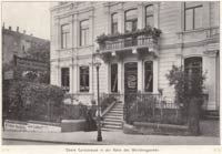 4.1 Die Schmidtmann-Villa Burgfeldstraße 8, aufgenommen nach Westen aus der Burgfeldstraße 9. Rechts hinter der Burgfeldstraße 8 ein Stall, heute steht dort das von Schmidtmann erbaute Haus Schloßteichstraße 5. Ganz rechts eine Ecke der Burgfeldstraße 6, dahinter der Turm der Schloßteichstraße 3. Auf der Eingangstreppe Heinrich Schmidtmann, am Erdgeschoßfenster seine zweite Frau Emma, geb. Buerdorf aus Hannover. |