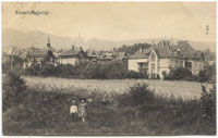 Panoramen von 1900 bis 1915: Die Panoramabilder zeigen, wie die Kolonie rasch grüner wurde. Der Druselbach-Grünzug, über den hinweg die Bilder aufgenommen sind, wurde nicht bebaut, sondern diente als natürliche Begrenzung der Kolonie. Diese wichtige Funktion hat er heute auch noch (siehe die Luftaufnahme am Anfang dieses Kapitels), aber er ist durch Bebauungsdruck gefährdet. So ist das Areal links unten im Bild von 1915, auf dem Kleingärten zu erahnen sind, im Jahr 2004 gerodet und mit »Stadtvillen« bebaut worden – gegen den Widerstand des Ortsbeirates. Die oberste Freifläche, diejenige zwischen Kurhausstraße und Brabanter Straße, wurde schon vor Jahren zu Bebauungszwecken aus dem Landschaftsschutz herausgenommen (noch ist aber nichts geschehen außer der drastisch größeren Neu-Bebauung des Grundstücks Kurhausstraße 28; möge dies so bleiben). Weitere Panorama-Aufnahmen von Mulang: siehe auch weiter unten am Anfang des Unterkapitels »Brabanter Straße«. |