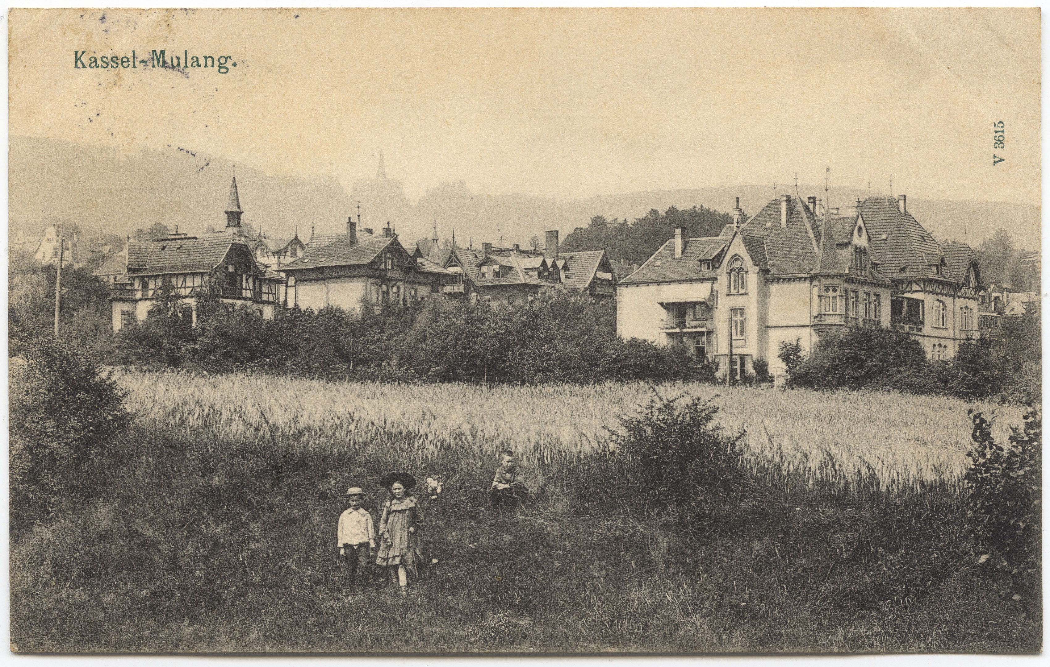 • Die obere Photographie zeigt den »Blick vom Hôtel Schloss Weissenstein« unweit des Bahnhofes Wilhelmshöhe über die Bebauung südlich der Wilhelmshöher Allee hinweg aufgenommen. Man sieht, wie die Villenkolonie in unmittelbarer Nähe des Parks liegt, noch getrennt vom Stadtteil Wilhelmshöhe und dem rechts der Wilhelmshöher Allee liegenden Dorf Wahlershausen. • Zweites Bild von oben: Blick aus dem Schmidtmann-Bau Landgraf-Karl-Straße 27 auf die Christuskirche und die Villenkolonie Mulang. • Drittes Bild von oben: Blick von der Christuskirche zur Villenkolonie. Ganz rechts unter dem Schloß Wilhelmshöhe die Kaltwasser-Heilanstalt Dr. Greveler (heute Ayurveda-Klinik). Auffällig ist der hineinmontierte Hinweis auf die Palmenbad-Station der Herkulesbahn (Kurhausstraße), links von der Kirche. • Unten: Die Aufnahme blickt auf Wahlershausen, genauer: auf den Tunnel unter der Eisenbahnstrecke und in die Lange Straße; das weiße Eckhaus ist erhalten. Der Bahnhof Wilhelmshöhe liegt weiter links. Unterhalb des Schlosses seiht man die Giebel der damaligen Bürgerschule und heutigen Reformschule, ganz links hinten, links vom Turm der Christuskirche, sieht man Rauch aus dem Schornstein des Henkelschen E-Werks zur Villenkolonie ziehen. |