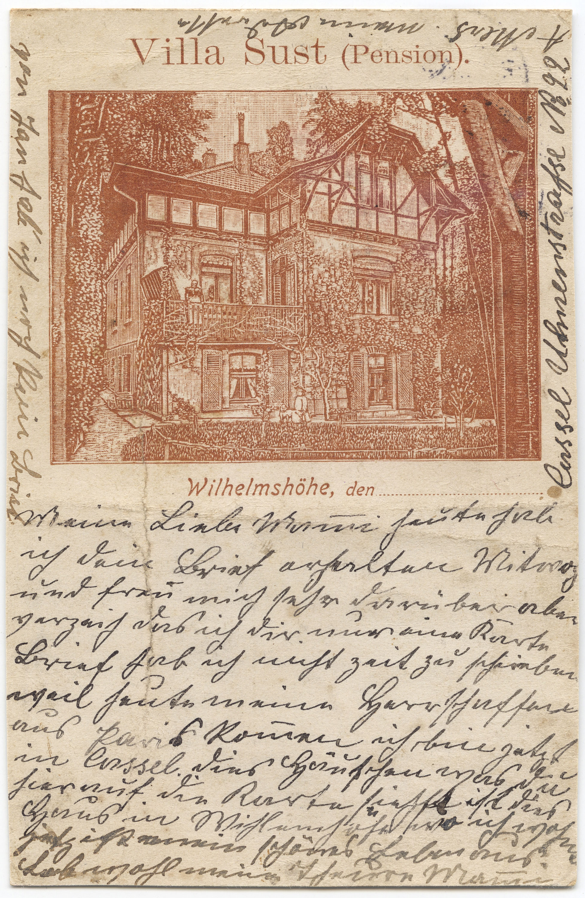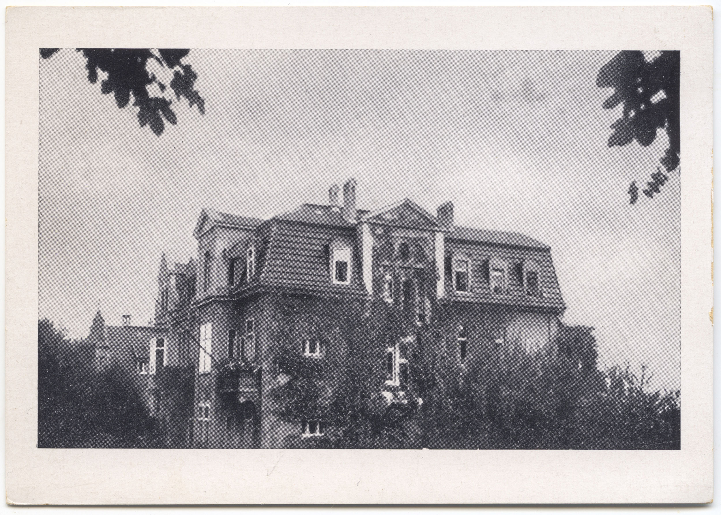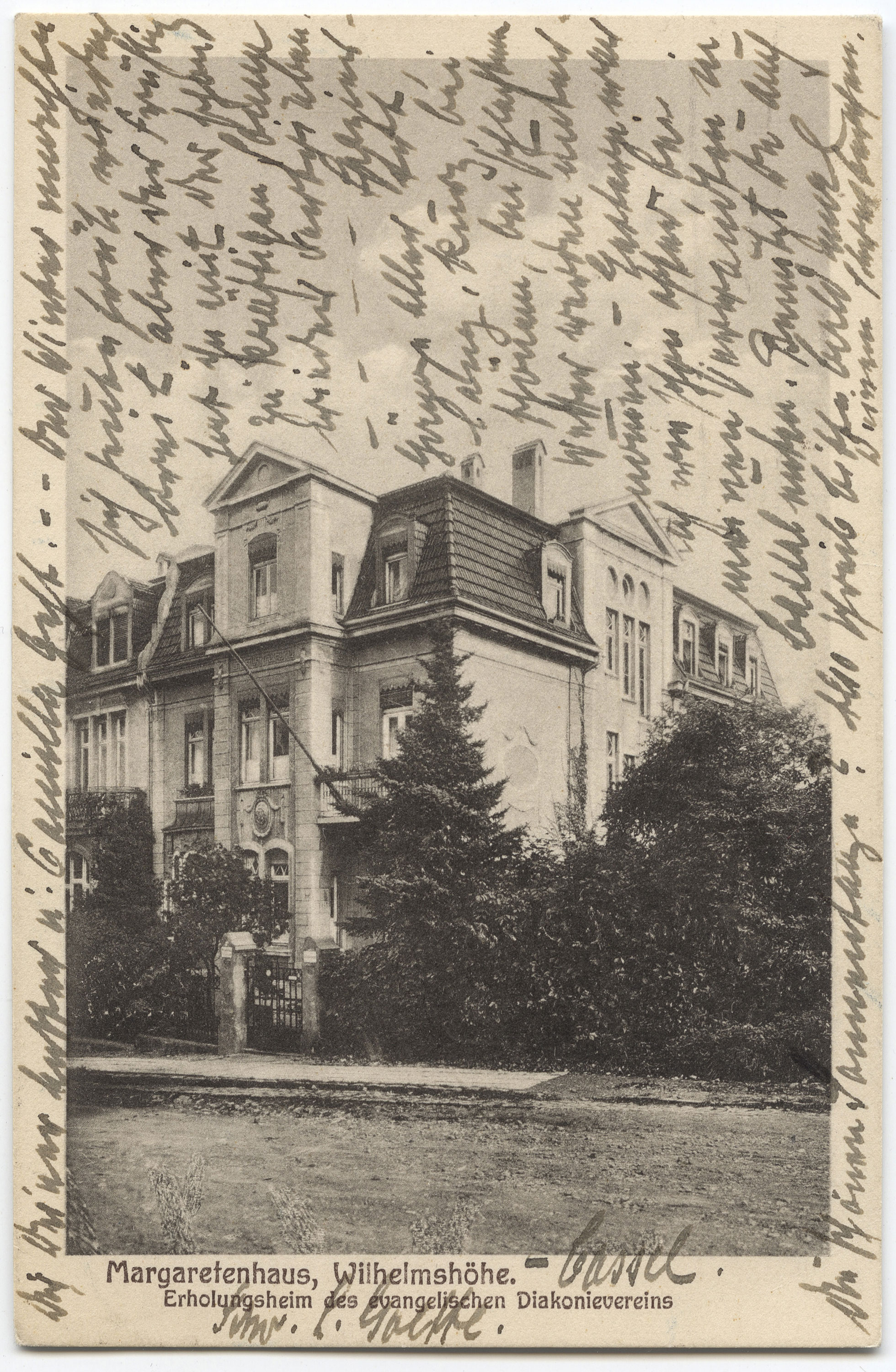 Hugo-Preuß-Straße 40 – »Fürstenstraße 20, Haus Abendfriede« (Aufdruck auf einer Postkarte mit identischem Motiv des obersten Bildes links). →Google-Maps »Parkartiges Areal in Randlage zum Bergpark mit unterschiedlich alten Bauten, heute zum Sitz des CVJM gehörend. Repräsentativer Altbau Villa Abendfrieden: Hoher und großvolumiger Massivbau über geländebedingt hohem Sockel. Neorenaissance- und Jugendstilanklänge. [...] Inschriftplatte an der westlichen Giebelseite: ›Villa Abendfrieden erbaut 1907‹. [...] 1950 wurde durch den damaligen Eigentümer, dem Hess. Siechenhaus Hofgeismar, ein in Kubatur angepasster Anbau an der Nordseite erstellt, zweigeschossig mit Hochkeller und ausgebautem Dach mit Wohnräumen für Angestellte. 1974 Erweiterung zum CVJM-Internat.«*17