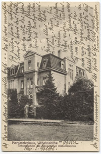 Das Haus Hugo-Preuß-Straße 2/2a (Mulangstraße 131 ½ bzw. Moulang-Straße 131 ½ bzw. Fürstenstraße 131 ½) gehört heute zur CVJM-Hochschule, vorher beherbergte es das Evangelische Fröbelseminar. →Google-Maps Errichtet wurde das große Eckhaus, das viel um- und einmal ganz neu gebaut wurde, als Bestandteil der Wiederholdschen Kuranstalt. Viele Bilder und die Geschichte der ganzen Häusergruppe: siehe das Kapitel »Kurort Wilhelmshöhe«, Unterkapitel: »Reichel / Dr. Wiederhold / Dr. Rohrbach«. |