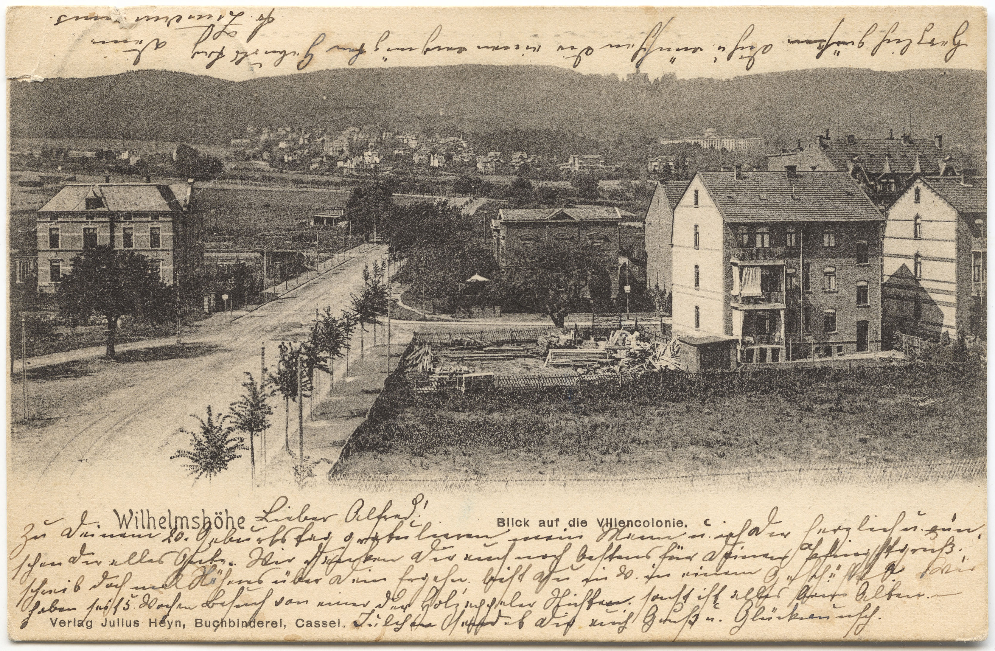 Verlag von Lina Müller, Wahlershausen (1903 gestempelt): Die Wilhelmshöher Allee in Richtung Bergpark. Auf dem Hause links kann man lesen: »[...] der Lippstädter Brauerei ›Weissen [...]«. Zwei Häuser weiter müßte die Wilhelmshöher Allee 283 sein.*MA