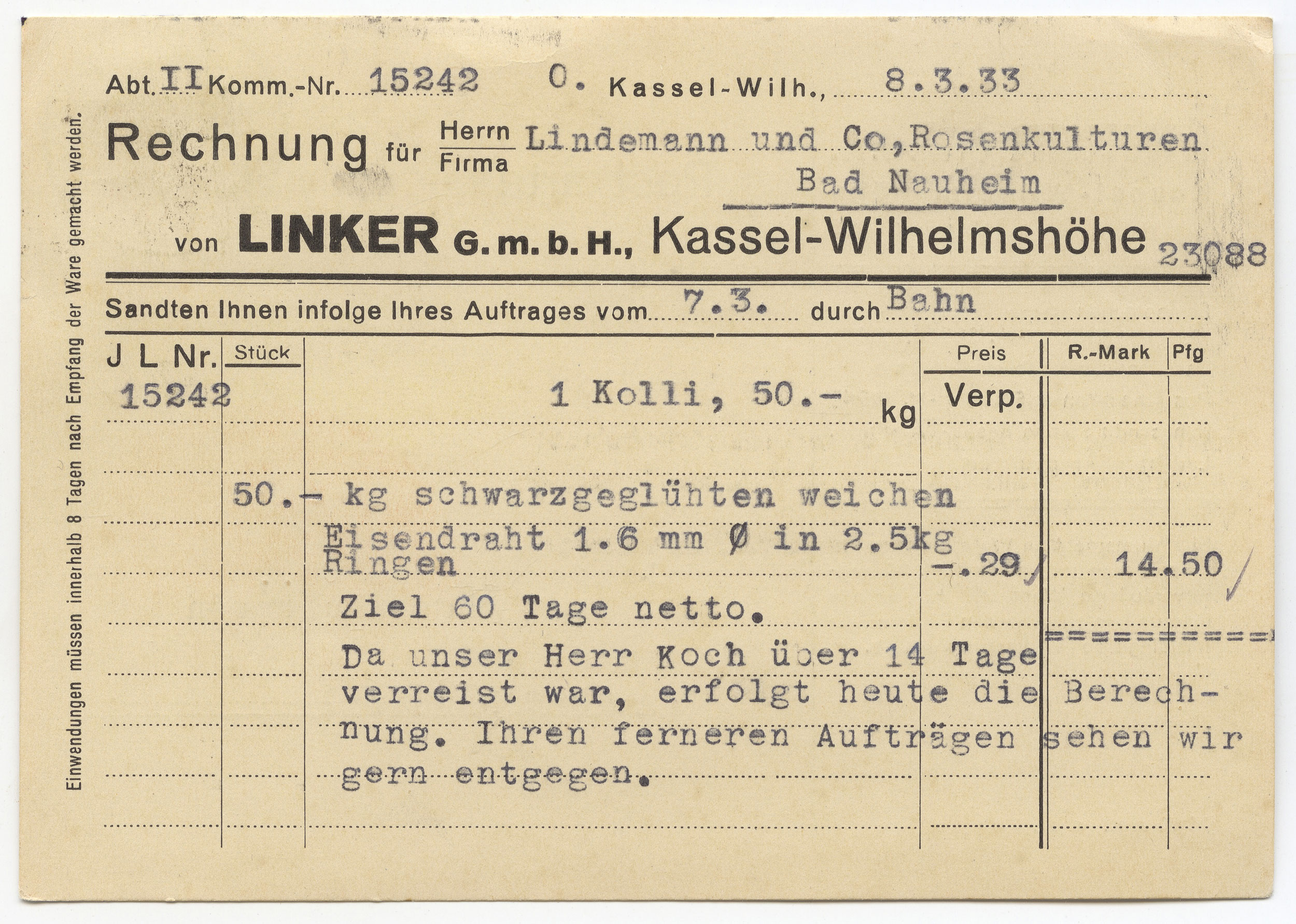 Darin viele Anzeigen von Wilhelmshöher und Kasseler Firmen (nur die Wilhelmshöher Firmen sind in die folgende Liste aufgenommen): [Seite 4:] Heinrich Schwedes, Ansichtskarten, Reiseandenken, Geschenkartikel, Wilhelmshöher Allee 313 und Verkaufspavillon am Betriebsbahnhof der Straßenbahn in Wilhelmshöhe | Brot- und Feinbäckerei Gottlob Markus, Lange Straße 13 | Schlossermeister H. Wagner, Wilhelmshöher Allee 333 | »Ihren Braten zum Reichskriegertrag nur von Fleischermeister Wilh. Hahn«, H. utte Nachfolger, Wilhelmshöher Allee 283 | Milchhandlung Georg Hoff, Wilhelmshöher Allee 281, 287 und 315 | Lebensmittel, Weine, Spirituosen, Hausschlachterei M. Schreurs, Wilhelmshöher Allee 276 | »Guirlanden zum Reichskriegertag liefert Blumenhaus Börner«, Kunoldstraße 22 | [Seite 5:] »Kochend aus der Wasserleitung strömt das Wasser, wenn Sie aan Stelle des Zapfhahnes einen Askania-Zapfhahnsieder anbringen lassen. Richard Riehl«, Wilhelmshöher Allee 289 | Malermeister, Schildermalerei Ludwig Ritz, Wilhelmshöher Allee 274 | [Seite 6:] Ansichtskarten, Reiseandenken, Büroartikel Ernst Stahr, Wilhelmshöher Allee 322 | Auto-Vermietung Wilhelmshöhe Oskar Flörke, Wilhelmshöher Allee 315 | Schuhmachermeister Heinrich Stein, Wilhelmshöher Allee 277 | Kunst-, Bau und Möbelschreinerei August Noll, Lange Straße 21 | Schuhinstandsetzung Wilhelmshöhe, Wilhelmshöher Allee 304 im Hause der Kaiser-Drogerie | Möbel W.Höhmann, Kunoldstraße 9 | [Seite 7:] Drogerie Wilhelmshöhe, Inhaber Hans Henss | Malergeschäft Müller & Schalles, Inhaber Wilhelm Schalles, Wilhelmshöher Allee 317 / Ecke Baunsbergstraße | Holzgroßhandlung Emil Liebeck, Wilhelmshöher Allee 272 Lebensmittel Heinrich Grandjot, Wilhelmshöher Allee 292 | [Seite 8:] Feinkost, Wandernahrung Georg Bohne, Wilhelmshöher Allee 279 | »Sie kochen doch ein?? Also decken Sie Ihren Bedarf ... bei Georg Burgtorff«, Wilhelmshöher Allee 279 | »Uniformen und Mäntel für sämtliche Formationen sowie feine Herrengarderobe« Selmar Fleischhauer, Lange Straße 21 | [Seite 9:] Elektro-Kühlschrank, Henkels elektrische Werke, Hunrodstraße 4 | Lebensmittel Martin Conrad, Wilhelmshöher Allee 326 | »Brot- und Backwaren, Schokoladen, Pralinen, Keks erster Firmen« M. Wittich, Wilhelmshöher Allee 283 | Fleischermeister Georg Seebach, Lange Straße 66, Landgraf-Karl-Straße 1 Ecke Wilhelmshöher Allee | [Seite 10:] Molkerei Friedrich Lindemann, Kunoldstraße 44 | Schumacher Jakob Lechtschinsky, Lange Straße 60 | Maurermeister Ludwig Rennert, Lange Straße 61 | Schreinerei Willi Fremder, Wasserweg 2 | [Seite 11:] Radioapparate Otto Bernhardt, Wilhelmshöher Allee 322 | Friseur Philipp Krieger, Wilhelmshöher Allee 313 | »Wir spannen Gardinen. waschen, bügeln und heißmangeln« Jünemann, Baunsbergstraße 1/2 | Bäckerei Karl Ruess, Wilhelmshöher Allee 324 Schreinerei Robert Franke, Wilhelmshöher Allee 294 | Blumen Heinrich Göllner, Landgraf-Karl-Straße 1 | Schreinerei Gebrüder Butte, Lange Straße 54 | Lebensmittel Friedrich Banze, An den Eichen 2 | Feinkosthaus Würzberg, Inhaber K. Knobbe, Wilhelmshöher Allee 295 | [Seite 12:] Baustoffhandlung Ernst Gehl & Co., Wilhelmshöher Allee 253 ¾ | Schneidermeister August Fey, Wilhelmshöher Allee 300 | »Ich ziehe um! Ab 25.6.33 befindet sich mein Geschäft Wilhelmshöher Allee 311 in den neu hergerichteten hygienisch einwandfreien, erstklassigen Räumen. (Neben Neubau Schwedes) Fleischermeister Louis Kleinschmidt | Lebensmittel, Hausschlachterei W. Siebert, Kunoldstraße 16 | Schuhinstandsetzung Herkules, Lange Straße 15 | [Seite 13:] Fleischermeister Franz Döring, Wilhelmshöher Allee 310 | Dach- und Schieferdeckermeister August Franke, nur Wasserweg 4 | »Zum Reichskriegertag kaufe Deine Zigarren und Weine beim Frontkameraden Hermann Göbel am Bahnhof Wilhelmshöhe« | Schuhwarenhandlung Georg Hektor, Kunoldstraße 32 | [Seite 14:] Kaffee- und Pensionshaus Dohn, Mulang [Kurhausstraße 8] [mit Bild auf S.15] | Diätkur- und Erholungsheim Sonnenhof, Krähhahnstraße 8 | Parkkaffee u. Fremdenheim A. Mössinger, Mulang, »Kaffeeaufgießen gestattet« [Kurhausstraße 2] [mit Bild auf S.15] | Schloßhotel Wilhelmshöhe, Inhaber M. Stecker | Gast- und Kaffeehaus »Zeche Marie«, Brasselsberg | Gaststätte Palmenbad J. O. Köberich, Rasenallee 27 [Kurhausstraße 25] [mit Bild auf S.15] | Burgfeld-Kaffee, Burgfeldstraße 1 [mit Bild auf S.15] | Gasthaus Ledderhose, Mulang [Löwenburgstraße 1] [mit Bild auf S.15] Gasthaus Rammelsberg, Inhaber Albin Thiele, Rammelsbergstraße 4 | Gasthaus Wimmer | Gasthaus am Fuße der Kaskaden, Inhaber Fritz Block [mit Bild auf S.15] | Kurhaus Dr. Rohrbach |