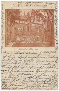 Hier klicken für die Anzeigenseiten aus »Augustins Reisehandbücher Nr. 5 – Habichtswald und Langenberg« von ca. 1910 (es ist dort das rote Büchlein in der linken Spalte). Darin eine Anzeige des Pensionshauses (»... Wöchentlich dreimal Militärkonzerte ...«).*MA